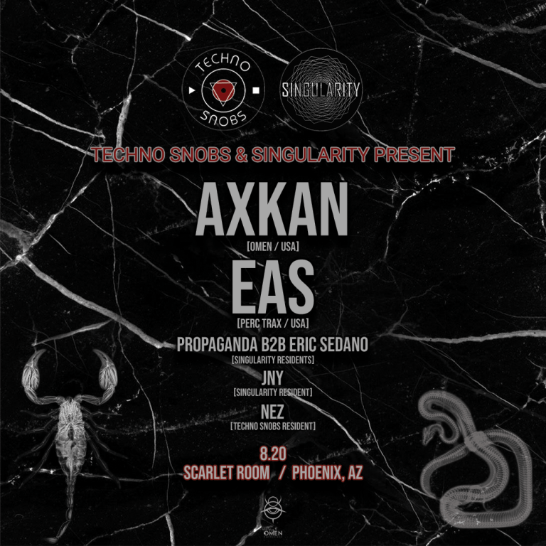 We are honored to be joining with Arizona’s infamous techno collective, Techno Snobs, to bring a night of raw dance music worthy of any warehouse. With sets from Omen Recordings label boss AXKAN and one of LA’s top industrial hard techno talents EAS , we are kicking off this relationship with bang.