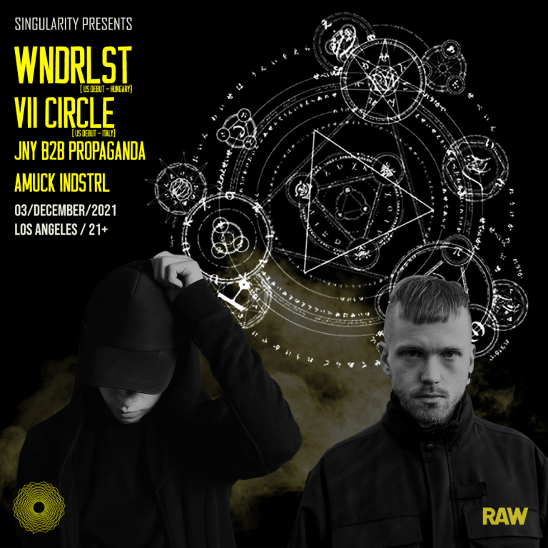 Also performing is Italian producer VII Circle . VII Circle makes his North American debut with us here at singularity for what promises to be an experience you wonβt want to miss out on. Having released on such massive labels such as HEX Recordings, Hardwax and RAW, his sound ranges from the deepest of ethereal soundscapes to the most crushing of industrial techno hell. VII Circles personal take on Techno has gotten him spots on lineups for such notable platforms such as Boiler Room, Intercell and RAWs Escape from Reality livestream series during event lockdowns. With a passion that is evident in all aspects of his musical approach, his set promises to be a real treat for us here on the west coast.